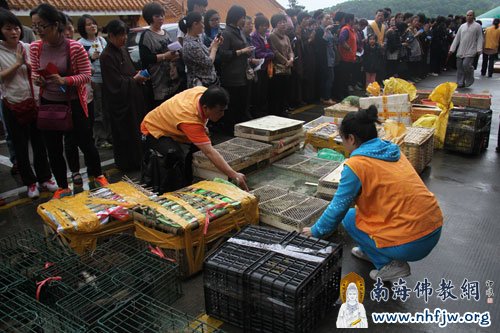 南海佛教深圳讯:4月8日下午3点,在弘法寺2014年清明思亲报恩水陆超度法会的第六天,弘法寺在斋堂门前举行了殊胜的放生法会。中国佛教协会副会长、海南省佛教协会会长、深圳弘法寺方丈印顺大和尚亲自主法,200多名水陆法会功德主及居士信众随喜参加放生仪式。梵音声声中,印顺大和尚引领大众依次拈香礼拜、诵念经咒,并代物命忏悔罪业、皈依三宝;同时祈愿国泰民安,风调雨顺,灾难消除,世界和平。