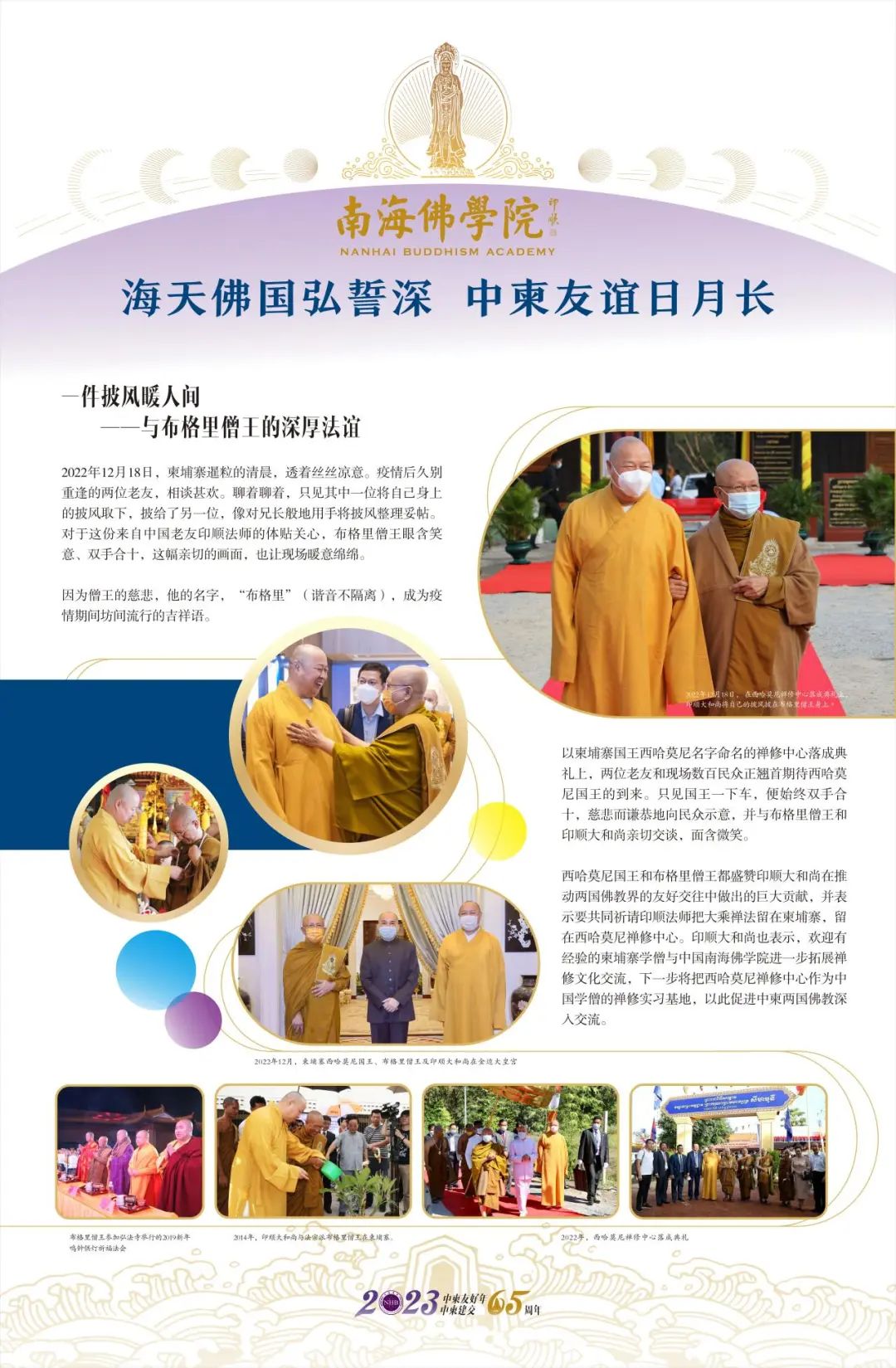 大道同行 和合共生 汇聚丝路华彩慧光 继2022年第七届南海佛教圆桌会 柬埔寨金边论坛之后 2023年12月10日至13日 第八届南海佛教圆桌会将 移师印度洋“佛法之岛” 于斯里兰卡首都举办 科伦坡论坛及系列活动 敬请期待   ▲科伦坡冈嘎拉马寺   今年是中柬建交65周年 在南海佛教圆桌会科伦坡论坛即将举办之际 我们用12集的篇幅 回顾中柬法谊走过的历程 带您走进金边论坛的高光时刻       2022年12月18日,柬埔寨暹粒的清晨,透着丝丝凉意。疫情后久别重逢的两位老友,相聊甚欢。聊着聊着,只见其中一位将自己身上的披风取下,披给了另一位,像对兄长般地用手将披风整理妥帖。     对于这份来自中国老友印顺法师的体贴关心,布格里僧王眼含笑意、双手合十,这幅亲切的画面,也让现场暖意绵绵。因为僧王的慈悲,他的名字,“布格里”(谐音不隔离),成为疫情期间坊间流行的吉祥语。     以柬埔寨国王西哈莫尼名字命名的禅修中心落成典礼上,两位老友和现场数百民众正翘首期待西哈莫尼国王的到来。只见国王一下车,便始终双手合十,慈悲而谦恭地向民众示意,并与布格里僧王和印顺大和尚亲切交谈,面含微笑。   西哈莫尼国王和布格里僧王都盛赞印顺大和尚在推动两国佛教界的友好交往中做出的巨大贡献,并表示要共同祈请印顺法师把大乘禅法留在柬埔寨,留在西哈莫尼禅修中心。     印顺大和尚也表示,欢迎有经验的柬埔寨学僧与中国南海佛学院进一步拓展禅修文化交流,下一步将把西哈莫尼禅修中心作为中国学僧的禅修实习基地,以此促进中柬两国佛教深入交流。   ▲2016年博鳌论坛   2016年和2017年,布格里僧王作为南传佛教代表,参加博鳌亚洲论坛宗教分论坛。他说,博鳌亚洲论坛宗教分论坛是一个具有国际影响力的高端论坛,通过此平台,为两国的世代交好注入了新能量。     从2016年开始,布格里僧王连续参加了四届南海佛教深圳圆桌会,并在2022年南海佛教金边论坛上发表主题演讲。他由衷感谢中国倡议的“一带一路”惠及了世界,并表示愿为世界文明的交流互鉴贡献宗教智慧,展现大爱担当。   ▲2016 年,印顺大和尚会见布格里僧王,布格里僧王与南海佛学院签订合作协议。    2016年10月,印顺大和尚聘请狄旺僧王与布格里僧王担任南海佛学院顾问,同时就柬埔寨派遣优秀僧人赴南海佛学院深造达成了一致协议。疫情后,这项计划已开始实施,中柬两国的佛教文化和学术交流将不断深化。