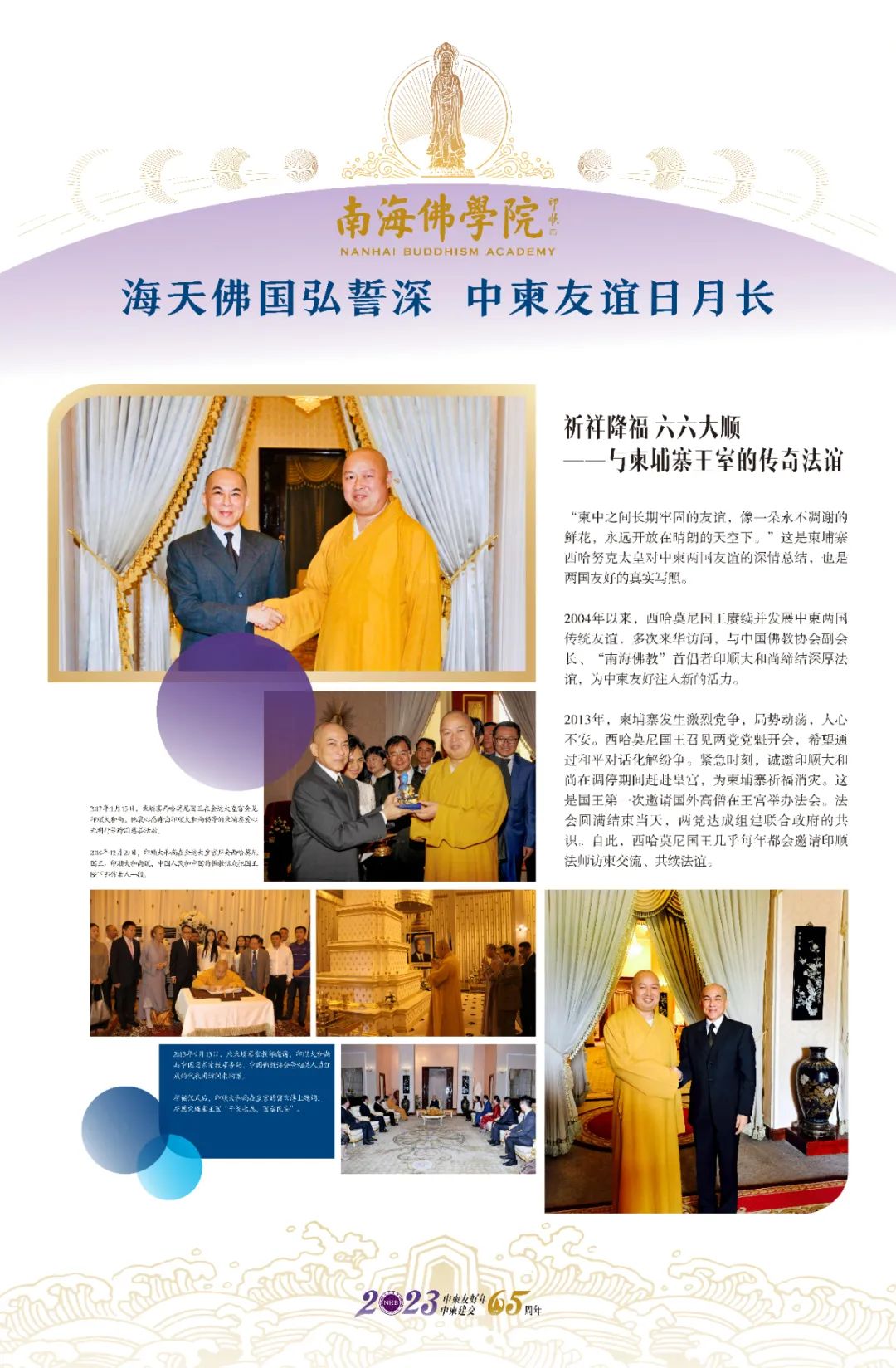 2004年以来,西哈莫尼国王赓续并发展中柬两国传统友谊,多次来华访问,与中国佛教协会副会长、“南海佛教”首倡者印顺大和尚缔结深厚法谊,为中柬友好注入新的活力。
