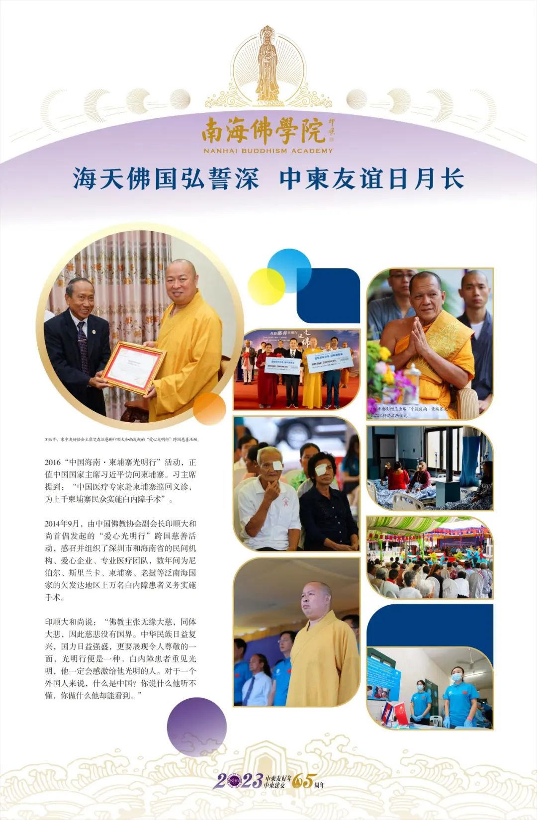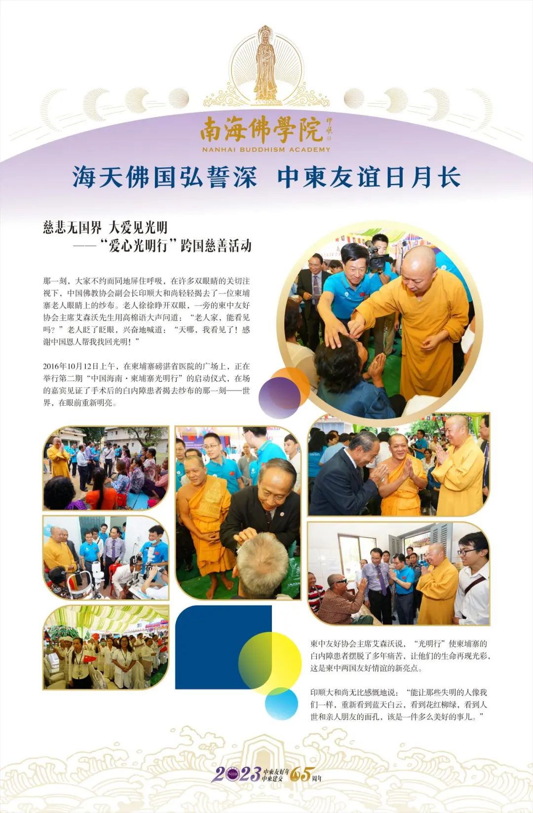 大道同行 和合共生 汇聚丝路华彩慧光 继2022年第七届南海佛教圆桌会 柬埔寨金边论坛之后 2023年12月10日至13日 第八届南海佛教圆桌会将 移师印度洋“佛法之岛” 于斯里兰卡首都举办 科伦坡论坛及系列活动 敬请期待 ▲科伦坡冈嘎拉马寺 今年是中柬建交65周年 在南海佛教圆桌会科伦坡论坛即将举办之际 我们用12集的篇幅 回顾中柬法谊走过的历程 带您走进金边论坛的高光时刻 那一刻,大家不约而同地屏住呼吸,在许多双眼睛的关切注视下,中国佛教协会副会长、海南省佛教协会会长印顺大和尚轻轻揭去了一位柬埔寨老人眼睛上的纱布。老人徐徐睁开双眼,一旁的柬中友好协会主席艾森沃先生用高棉语大声问道:“老人家,能看见吗?”老人眨了眨眼,兴奋地喊道:“天哪,我看见了!感谢中国恩人帮我找回光明!” 2016年10月12日上午,在柬埔寨磅湛省医院的广场上,正在举行第二期“中国海南·柬埔寨光明行”的启动仪式,在场的嘉宾见证了手术后的白内障患者揭去纱布的那一刻——世界,在眼前重新明亮。 此次活动正值中国国家主席习近平访问柬埔寨。习主席提到:“中国医疗专家赴柬埔寨巡回义诊,为上千柬埔寨民众实施白内障手术”。 2014 年9月,由中国佛教协会副会长、海南省佛教协会会长印顺大和尚首倡发起的“爱心光明行”跨国慈善活动,感召并组织了深圳市和海南省的民间机构、爱心企业、专业医疗团队,数年间为尼泊尔、斯里兰卡、柬埔寨、老挝等泛南海国家的欠发达地区上万名白内障患者义务实施手术。 印顺大和尚说:“佛教主张无缘大慈,同体大悲,因此慈悲没有国界。中华民族日益复兴,国力日益强盛,更要展现令人尊敬的一面,光明行便是一种。白内障患者重见光明,他一定会感激给他光明的人。对于一个外国人来说,什么是中国?你说什么他听不懂,你做什么他却能看到。” ▲2023年5月尼泊尔卫塞节期间,举行的“潮青光明行”走进佛陀的故乡——尼泊尔加德满都白内障救助项目启动仪式。 爱出者爱返,福往者福来。习近平主席在一次对斯里兰卡的国事访问曾经提到:“近年来,中国越来越多的眼疾病人接受了来自斯里兰卡眼库的角膜捐赠,重见光明,开启了心灵之窗。中国人民对斯里兰卡人民的真挚情谊铭记在心。” ▲2023年5月尼泊尔卫塞节期间,在蓝毗尼举办了慈善光明行助医助教活动。 如今,我们不仅要把这份大爱传播出去,让更多眼疾患者重见光明,而且,还要将这份光明之爱重新传递回斯里兰卡!在12月11日~13日,即将于斯里兰卡首都举办第八届南海佛教圆桌会科伦坡论坛,届时,不仅有精彩纷呈的论坛演讲,还有在科伦坡启动的“慈善光明行”活动,由来自中国的眼科专家义诊,为斯里兰卡的广大白内障眼疾患者义务手术,揭去黑暗,带来光明,相信这种跨越国界的慈悲大爱精神将伴随着佛法的传播,走遍世界每个角落。 往期回顾点击下方标题
