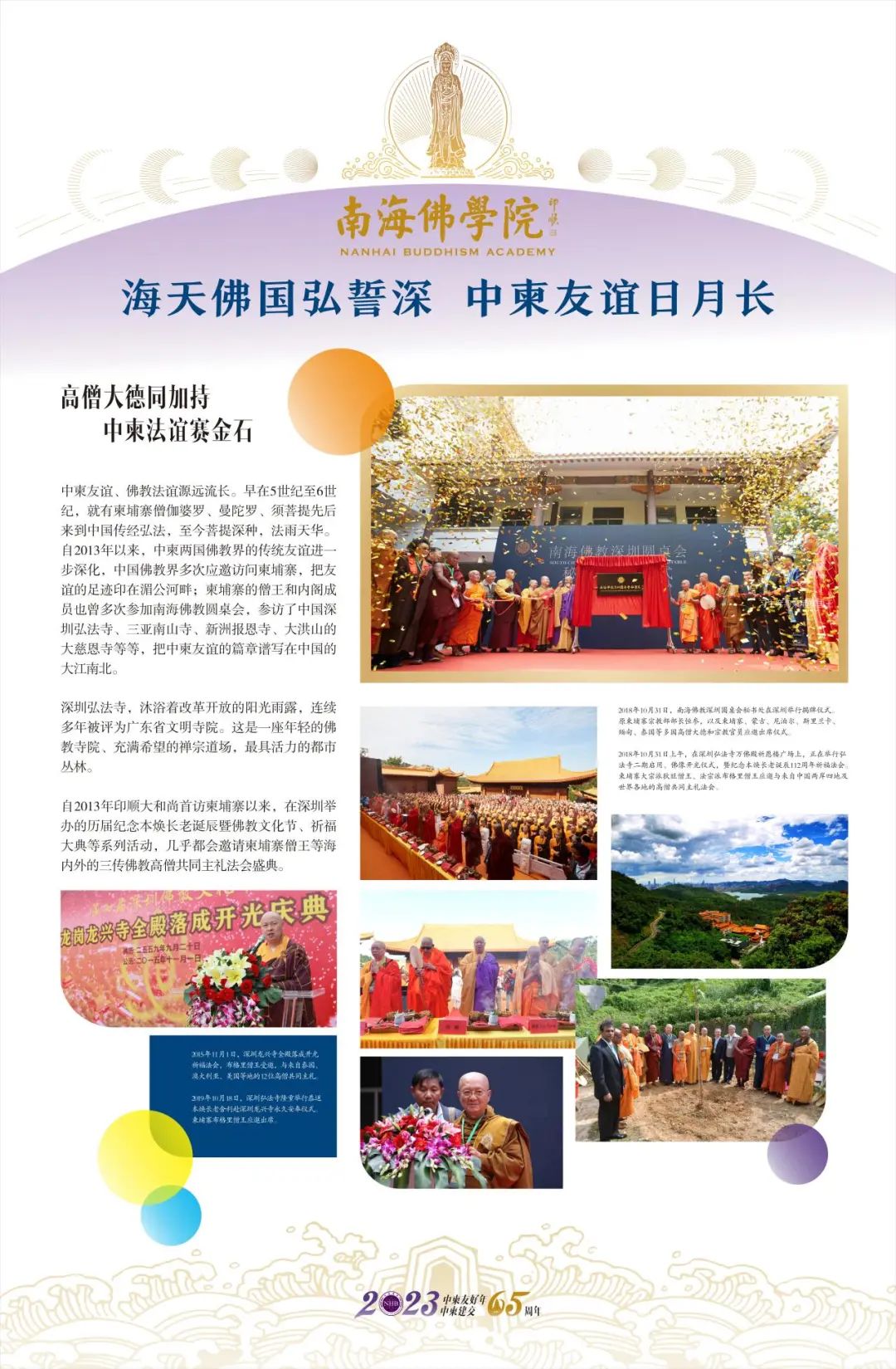 大道同行 和合共生 汇聚丝路华彩慧光 继2022年第七届南海佛教圆桌会 柬埔寨金边论坛之后 2023年12月10日至13日 第八届南海佛教圆桌会将 移师印度洋“佛法之岛” 于斯里兰卡首都举办 科伦坡论坛及系列活动 敬请期待 ▲斯里兰卡冈嘎拉马寺 今年是中柬建交65周年 在南海佛教圆桌会科伦坡论坛即将举办之际 我们用12集的篇幅 回顾中柬法谊走过的历程 带您走进金边论坛的高光时刻 中柬友谊、佛教法谊源远流长。早在5世纪至6世纪,就有柬埔寨僧伽婆罗、曼陀罗、须菩提先后来到中国传经弘法,至今菩提深种,法雨天华。 ▲摄于2022年12月13日,在金边本焕塔下玩耍的柬埔寨儿童。 自2013年以来,中柬两国佛教界的传统友谊进一步深化,中国佛教界多次应邀访问柬埔寨,把友谊的足迹印在湄公河畔晨钟暮鼓之中。 ▲2022年12月14日,金边乌龙山波莱波郎寺本焕塔祈福法会。 柬埔寨的僧王和内阁成员也曾多次参加南海佛教圆桌会,参访了中国深圳弘法寺、三亚南山寺、新洲报恩寺、大洪山的大慈恩寺等等,把中柬友谊的篇章谱写在中国的大江南北。 ▲2018年10月31日,南海佛教深圳圆桌会秘书处在深圳举行揭牌仪式。原柬埔寨宗教部部长恒参,以及柬埔寨、蒙古、尼泊尔、斯里兰卡、缅甸、泰国等多国高僧大德和宗教官员应邀出席仪式。 深圳弘法寺,沐浴着改革开放的阳光雨露,连续多年被评为广东省文明寺院。这是一座年轻的佛教寺院、充满希望的禅宗道场,最具活力的都市丛林。 自2013年印顺大和尚首访柬埔寨以来,在深圳举办的历届纪念本焕长老诞辰暨佛教文化节、祈福大典等系列活动,几乎都会邀请柬埔寨僧王等海内外的三传佛教高僧共同主礼法会盛典。 ▲2018年10月31日上午,在深圳弘法寺万佛殿祈愿楼广场上,正在举行弘法寺二期启用、佛像开光仪式,暨纪念本焕长老诞辰112周年祈福法会。柬埔寨大宗派狄旺僧王、法宗派布格里僧王应邀与来自中国两岸四地及世界各地的高僧共同主礼法会。 湖北随州大洪山大慈恩寺是佛教曹洞宗的发祥地,始建于唐朝宝历二年(公元826年)。2009年,湖北省政府确立恢复大洪山"佛教名山,养生天堂"地位,礼请佛门泰斗、原中国佛教协会名誉会长本焕长老重建大慈恩寺。 后由本焕长老衣钵弟子印顺大和尚续建,2013年全堂佛像开光。2015年,佛门泰斗本焕长老舍利永久安奉大慈恩寺金顶。 ▲柬埔寨都彭僧王应邀参加湖北随州大洪山大慈恩寺恭迎本焕长老舍利回山永久供奉祈福盛典。 湖北武汉新洲报恩禅寺始建于公元506年南朝梁代梁武帝萧衍天监年间,至今已有1500多年历史。 于1989年由佛门泰斗本焕长老捐资重建。新洲报恩禅寺是本焕长老22岁出家的地方。 ▲2015年9月26日,报恩禅寺举行万佛宝塔落成开光庆典暨本焕长老舍利安奉法会,柬埔寨僧王瑙极乐长老与来自汉传、南传、藏传佛教的大师们共同登坛主法,柬埔寨民宗局副局长棉桑南、柬中友好协会副主席张云峰勋爵及夫人也出席了典礼。 广东三水本焕寺成立于2015年,是本焕长老生前发愿建设的寺院之一,也是国内唯一一座以当代高僧德号命名的寺院,是本焕长老精神延续的重要承载。 本焕寺环山面水,湖明山清,被誉为广佛地区的“莲花佛国”。 ▲2016年10月21日 三水本焕寺迎请本老舍利,都彭长老、本玛•辛玛蓬长老在大雄宝殿主法。 由国家宗教事务局批准建设的南海佛学院,是世界首所圆融佛教三传、同摄四众弟子、并面向海外招生的佛学院。目前已有20名老挝留学僧和4名蒙古国留学僧在南海佛学院学习并顺利结业。2023年又迎来10名柬埔寨留学生与34名尼泊尔留学生来校学习。 ▲南海佛学院柬埔寨、尼泊尔留学生代表一行20人,10月14日由三亚出发,一路北上,感受中华禅文化,分别参访了广州光孝寺、深圳弘法寺、深圳大华兴寺、武汉宝通寺、新州报恩寺、孝感心虔寺等,历时五天,抵达随州大洪山大慈恩寺,参加2023大洪山禅文化论坛。 往期回顾点击下方标题
